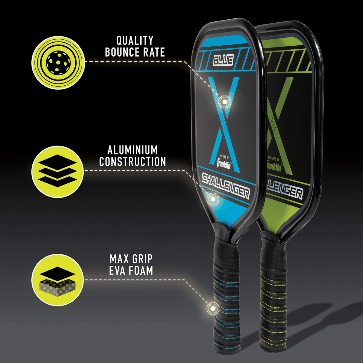 The Challenger is a pickleball racket / paddle from the Franklin range, one of the major American brands on the market. This paddle has an aluminum core and striking surface. The handle has a superior grip and offers great comfort. The Challenger has a plastic protective edge to maximize paddle life. The Franklin Challenger racket is suitable for novice players who want to get acquainted with pickleball.